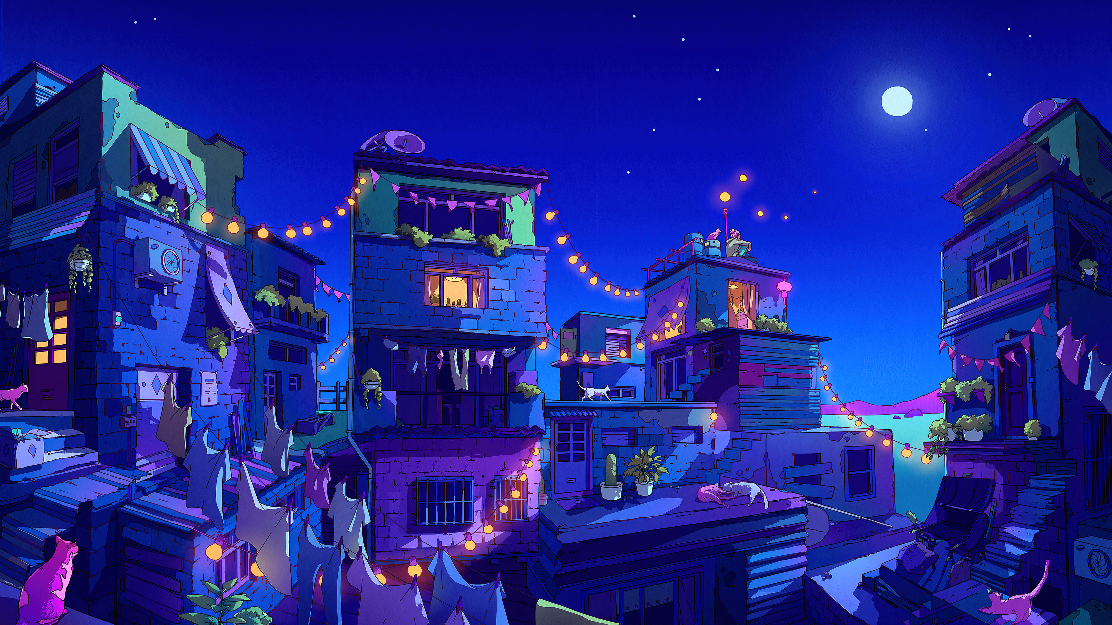 冬天的夜晚,一轮圆月的影子,几点稀疏的星光,加上近地面人家楼房窗户间流溢出来的万家灯火,在天光云影和人间烟火的混杂中,抬头俯仰之间,自然生发出头脑中关于天地人合一的温馨与酣畅!